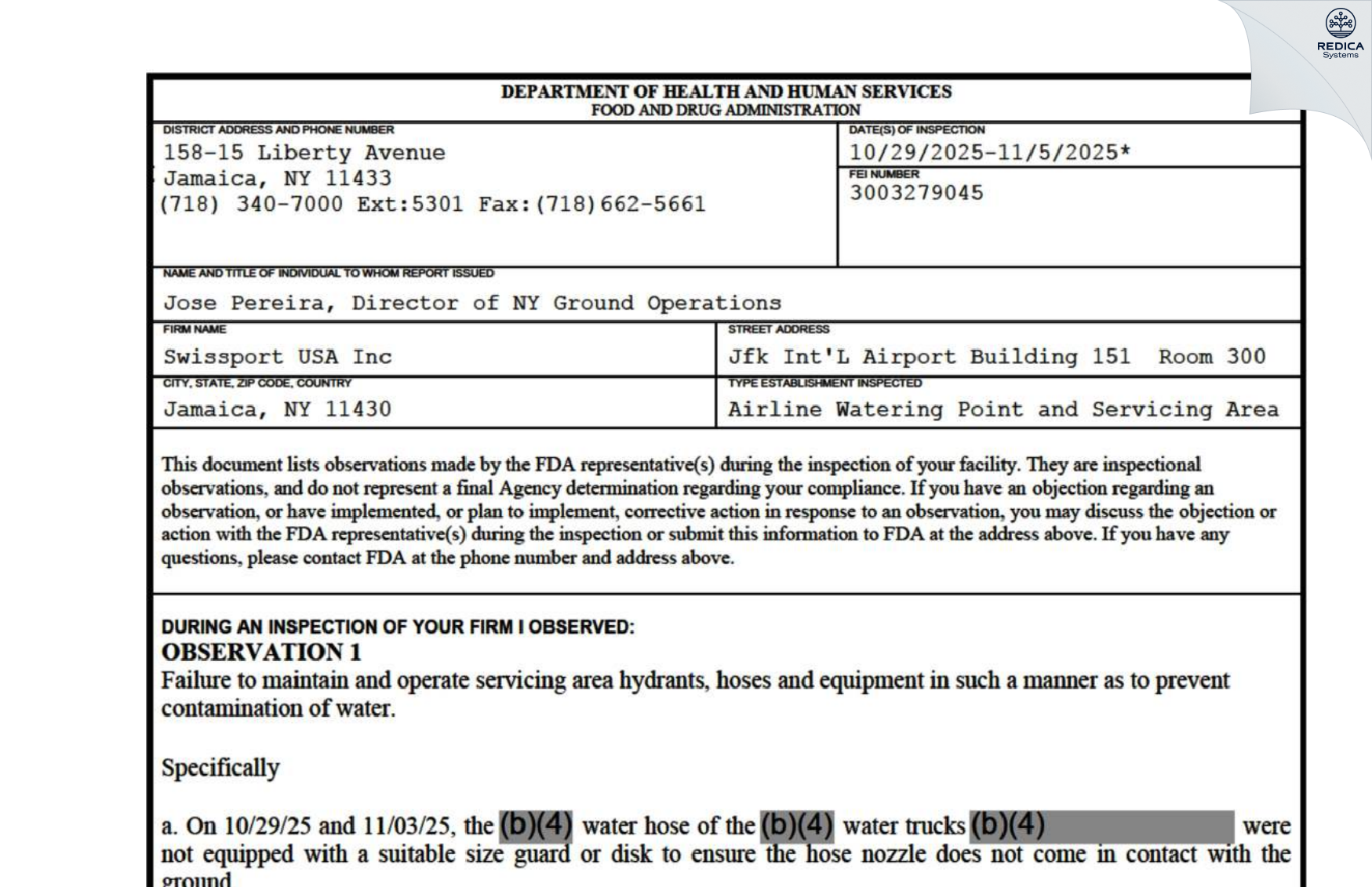Swissport USA Inc - Form 483, 2025-11-05 - Redica Systems Store