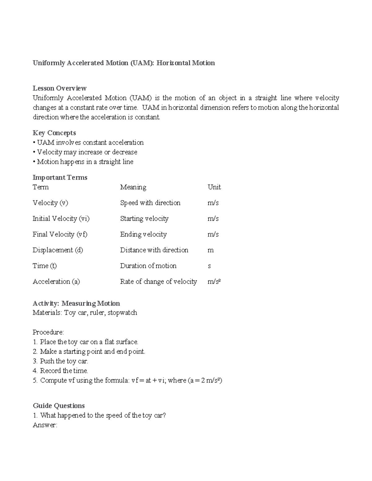 UAM: Horizontal Motion Lesson Overview and Key Concepts - Studocu