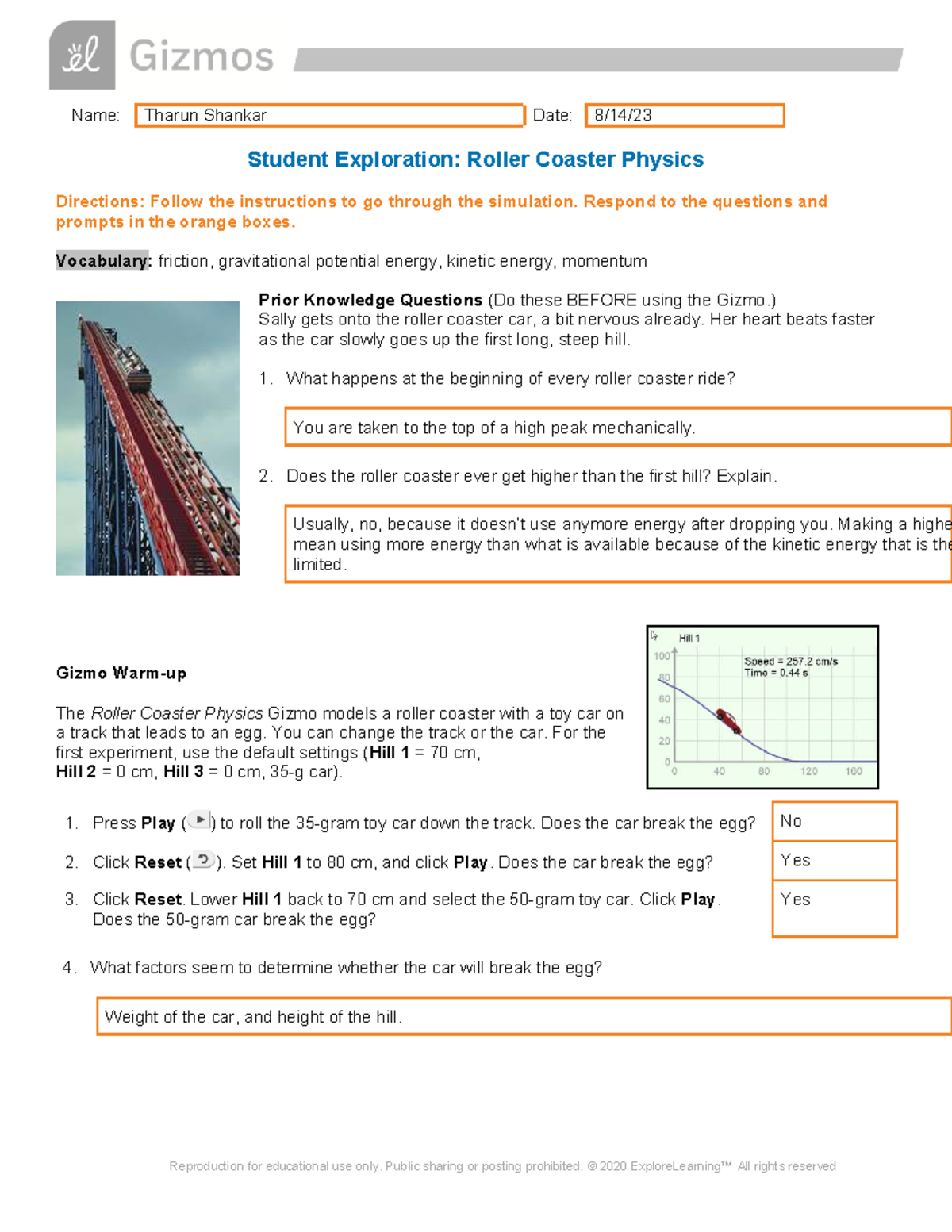 Roller Coaster Physics Exploration: Gizmo Activity Guide - Studocu