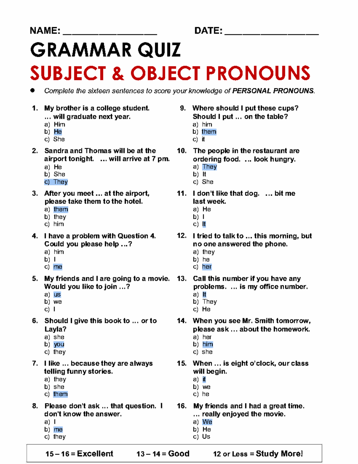 ENG 101: Grammar Quiz on Subject/Object Pronouns - Studocu