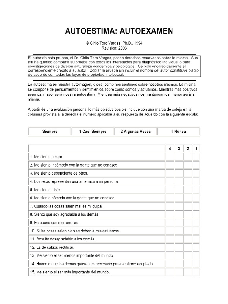 AUTOESTIMA - AUTOEXAMEN © Cirilo Toro Vargas, PH.D., 1994 Revisión ...