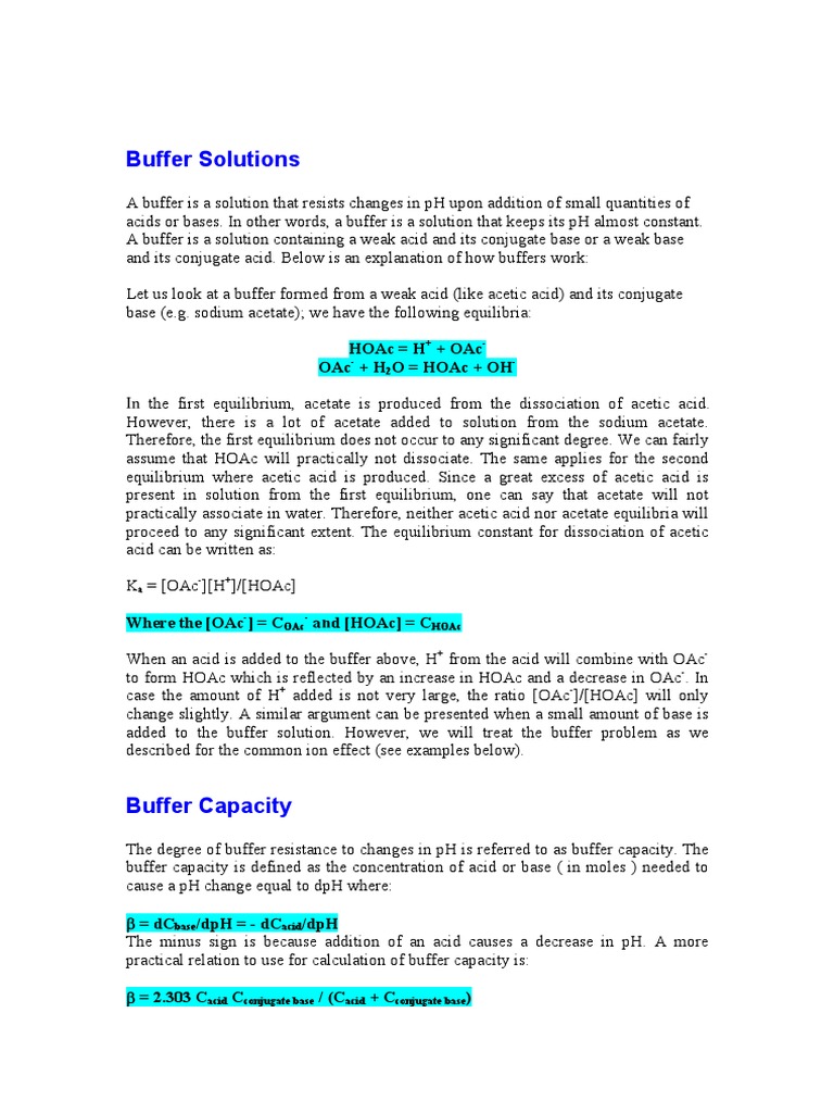 Buffer Solutions: Hoac H + Oac Oac + H O Hoac + Oh | PDF | Buffer ...