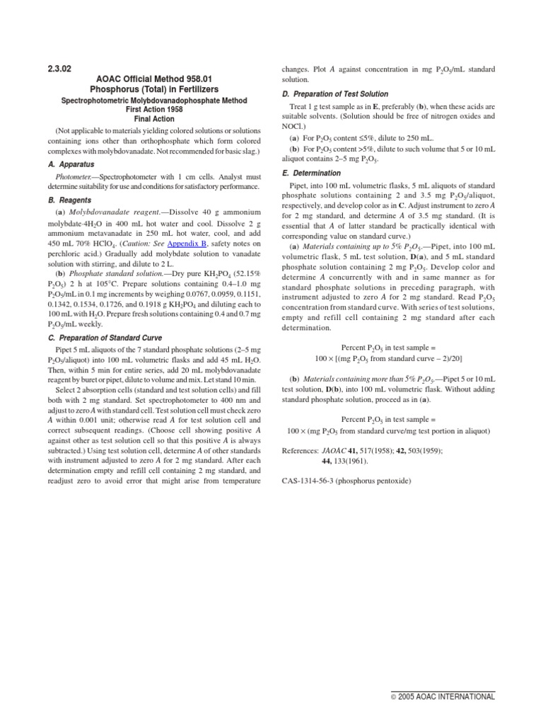 2.3.02 AOAC of Fi Cial Method 958.01 Phos Pho Rus (To Tal) in Fer Til ...