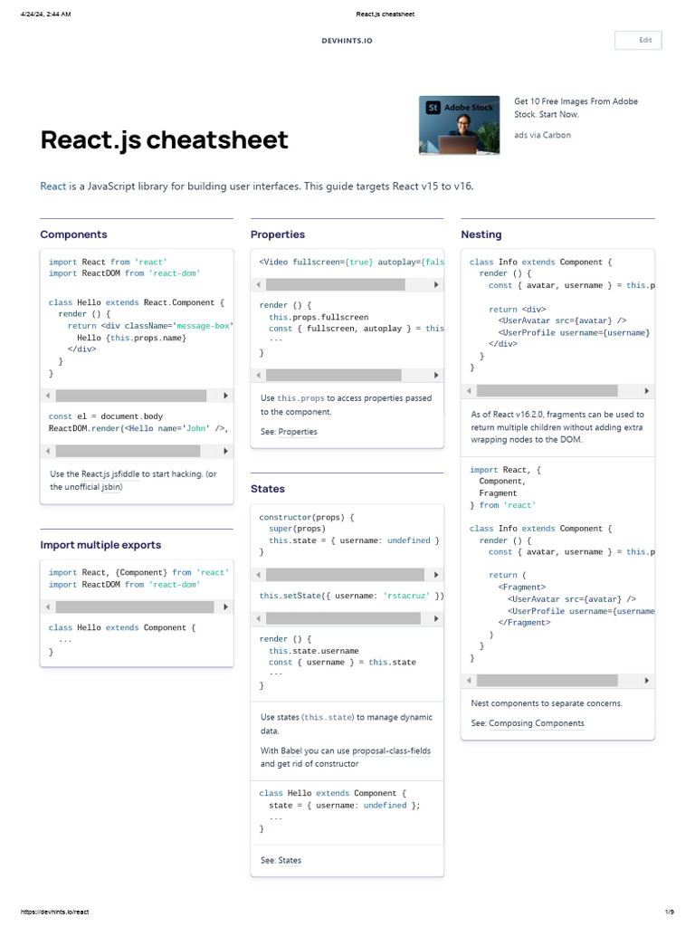 React.js cheatsheet | PDF | Document Object Model | Computing