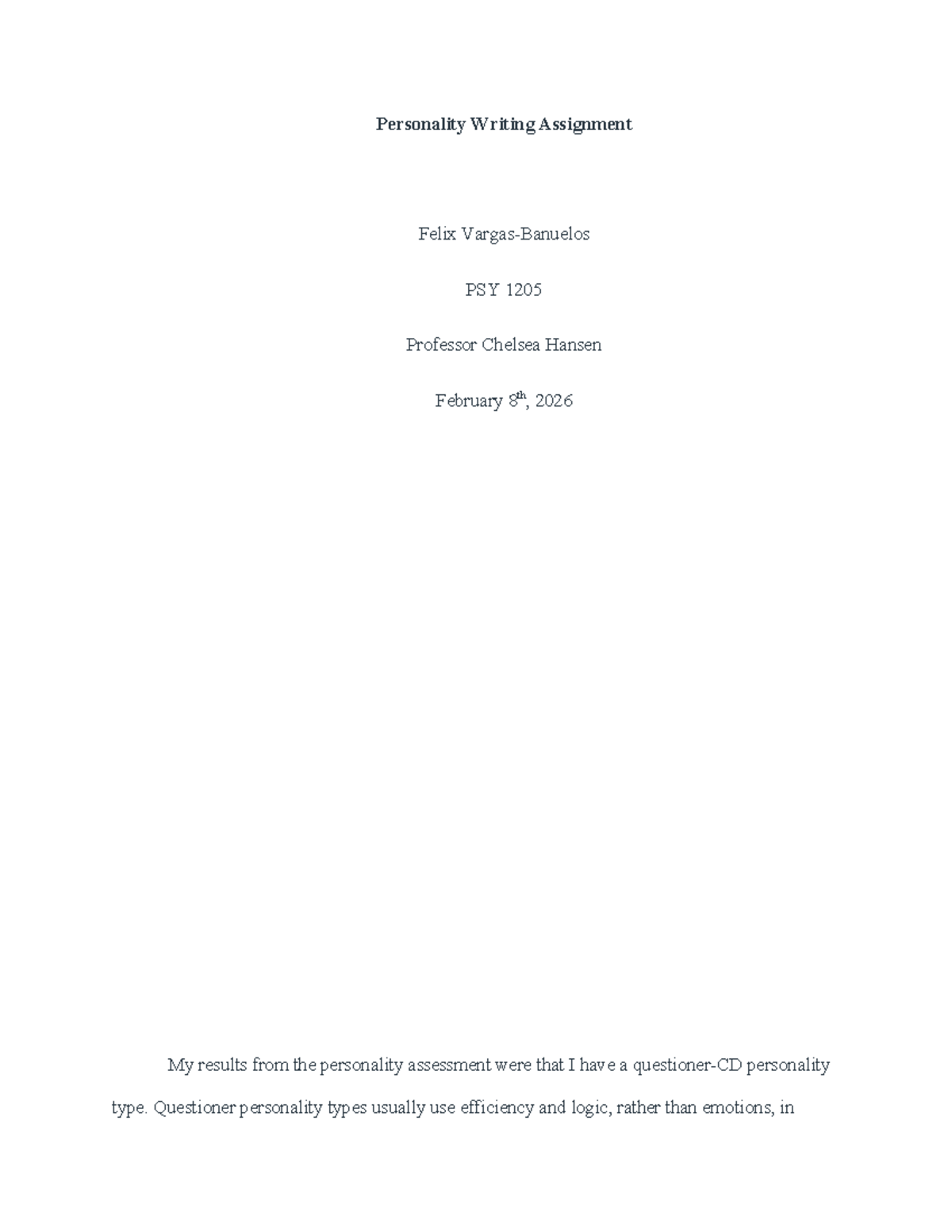 Personality Writing Assignment: Insights from PSY 1205 - Studocu