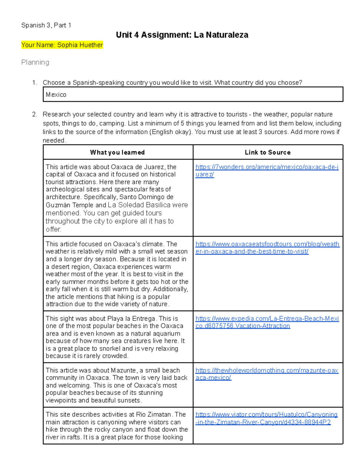 Spanish 3.1 Unit 4 Assignment: Exploring Nature in Mexico - Studocu