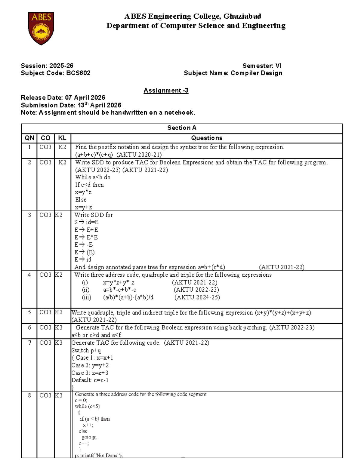 BCS602 Compiler Design Unit 3 Assignment (2025-26) - Studocu