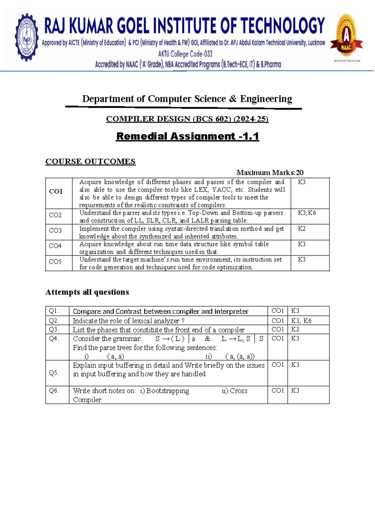 Remedial Assignment on Compiler Design (BCS 602) - Max Marks: 20 - Studocu