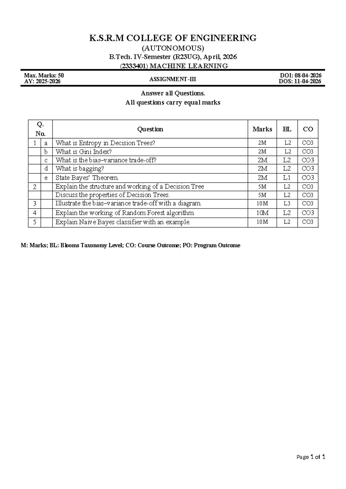Assignment-3: Machine Learning (B.Tech R23UG) - All Questions - Studocu