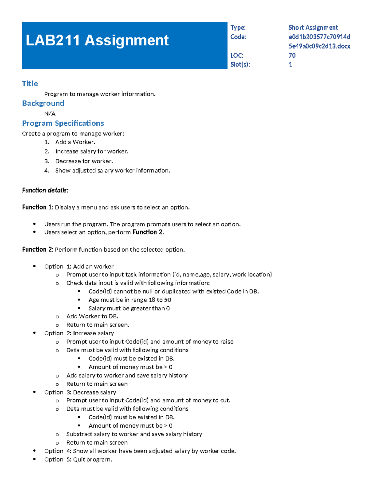 LAB211 Final Assignment: Worker Management Program Implementation - Studocu