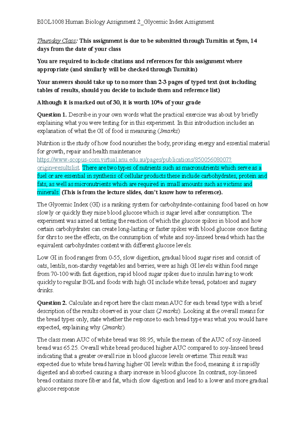 BIOL1008 Human Biology Assignment 2: Glycemic Index Analysis - Studocu