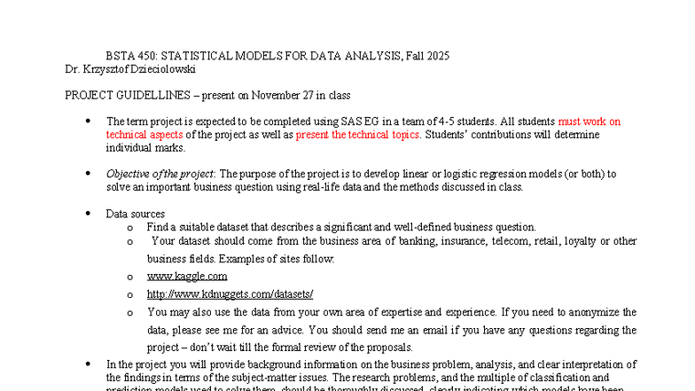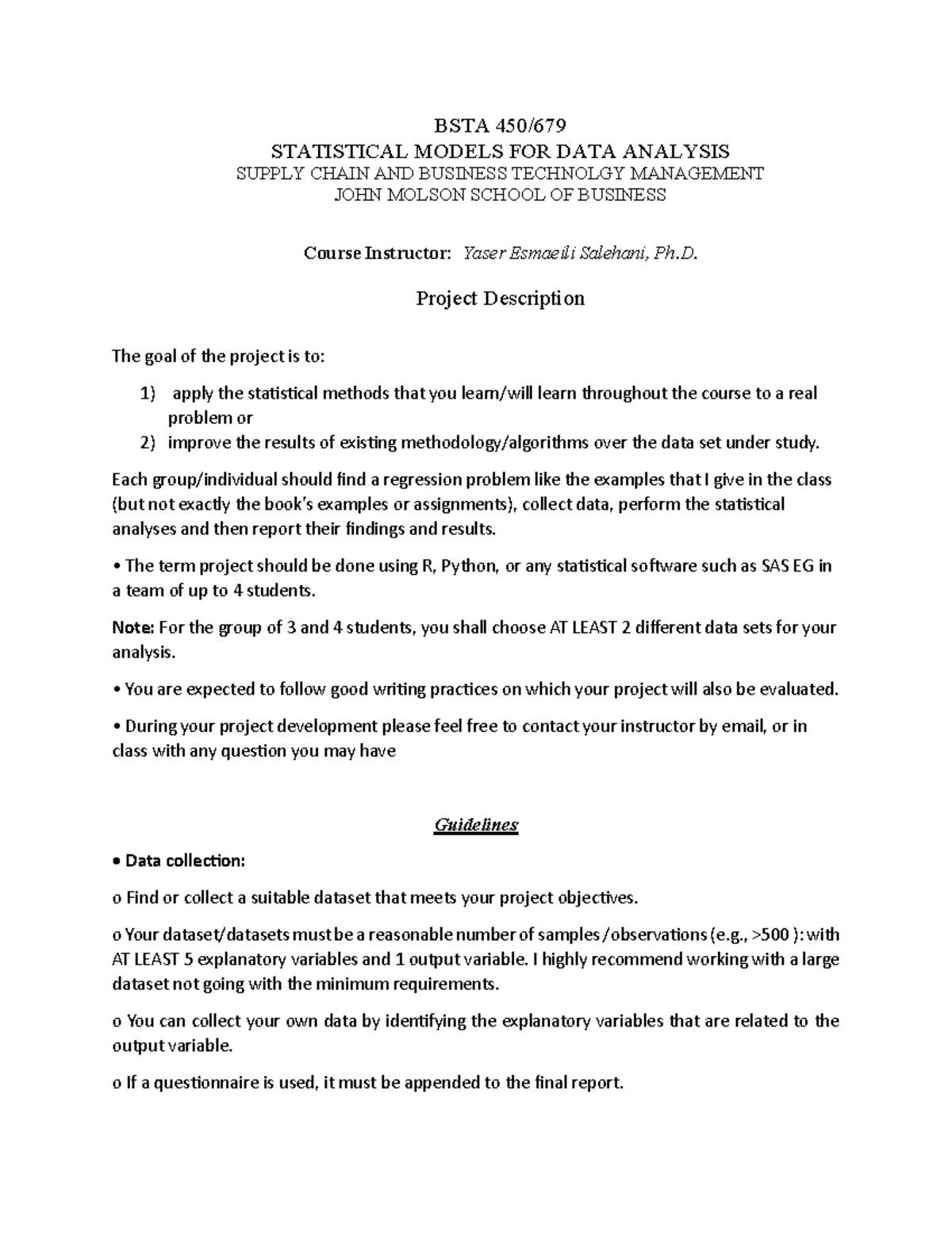 BSTA 450: Project Guidelines for Statistical Models, Fall 2025 - Studocu