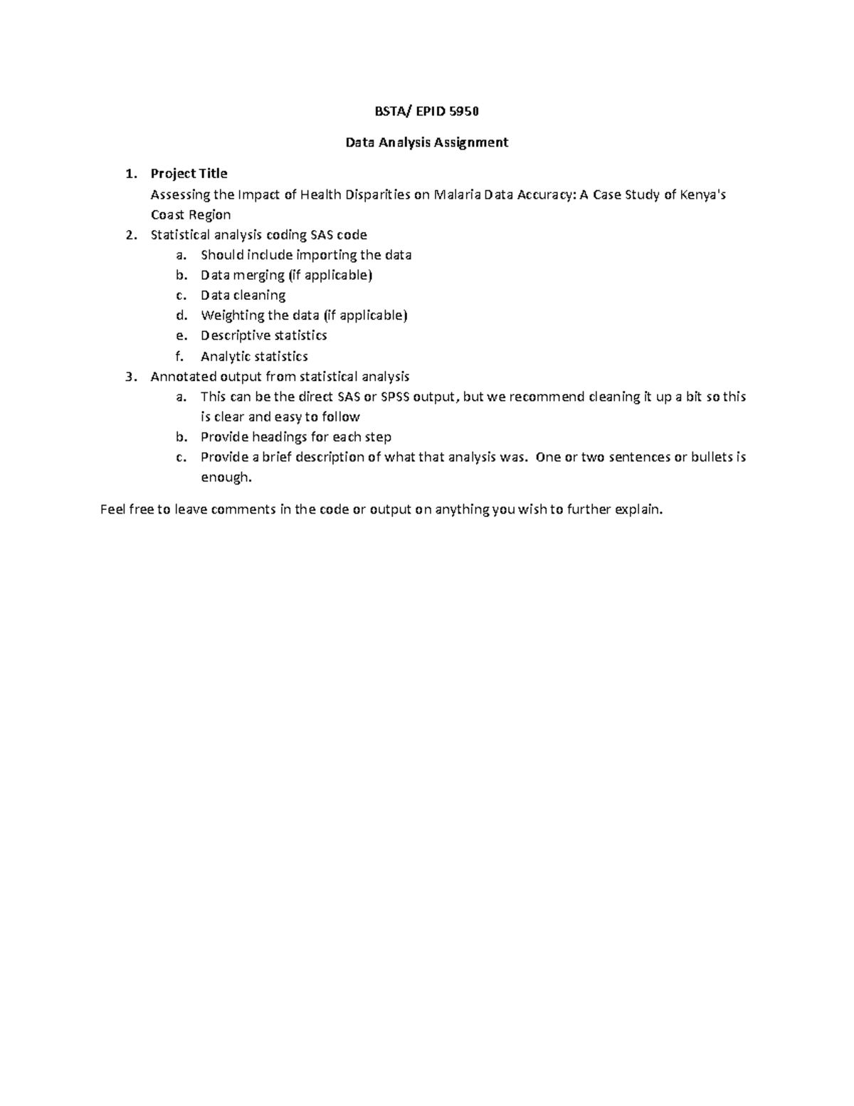 Analysis Assignment SAS - BSTA/ EPID 5950 Data Analysis Assignment ...