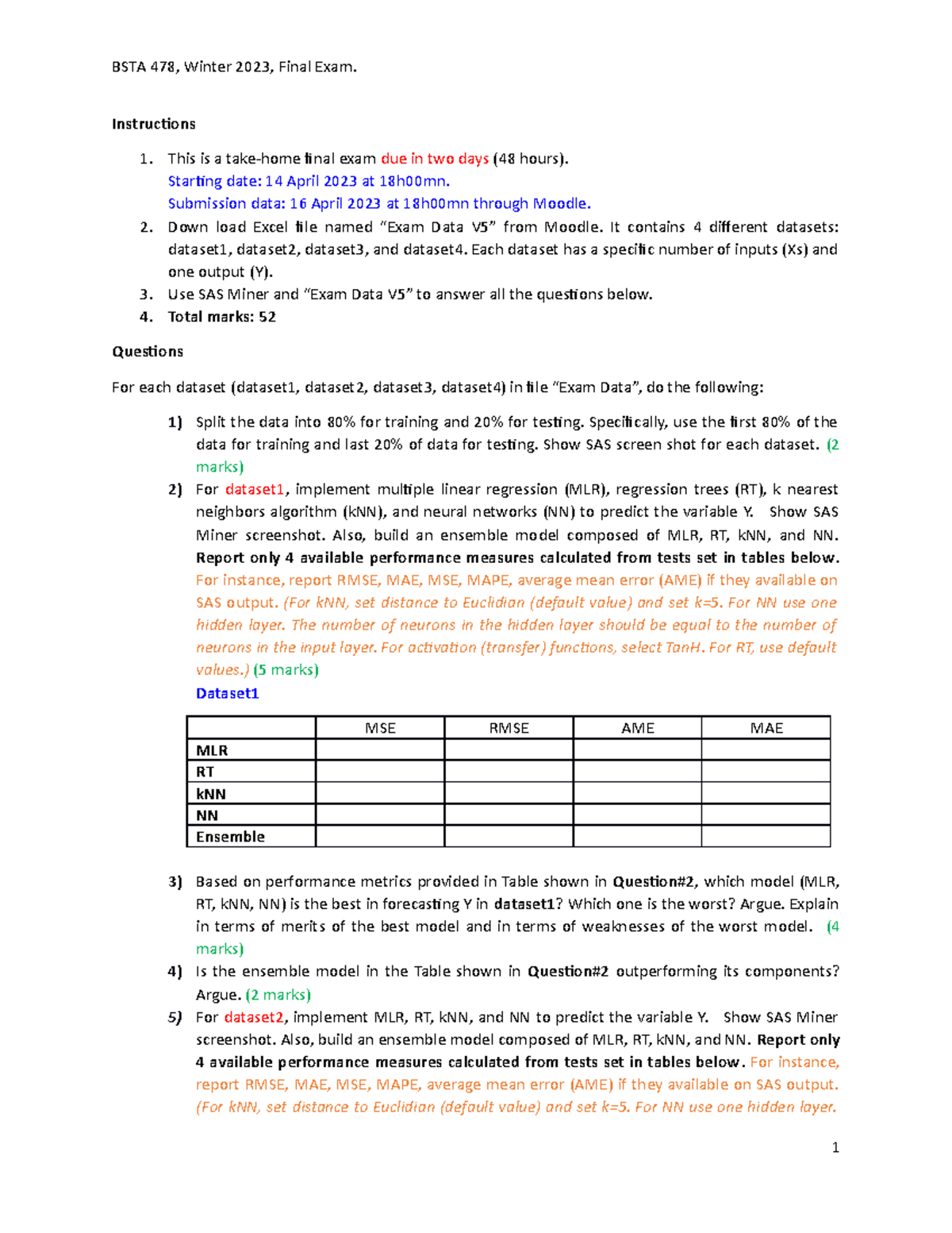 BSTA 478 Winter 2023 Final Exam: Data Analysis with SAS Miner - Studocu