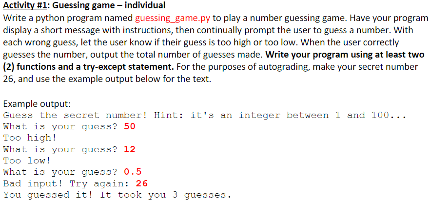 Solved Activity #1: Guessing game - individual Write a | Chegg.com
