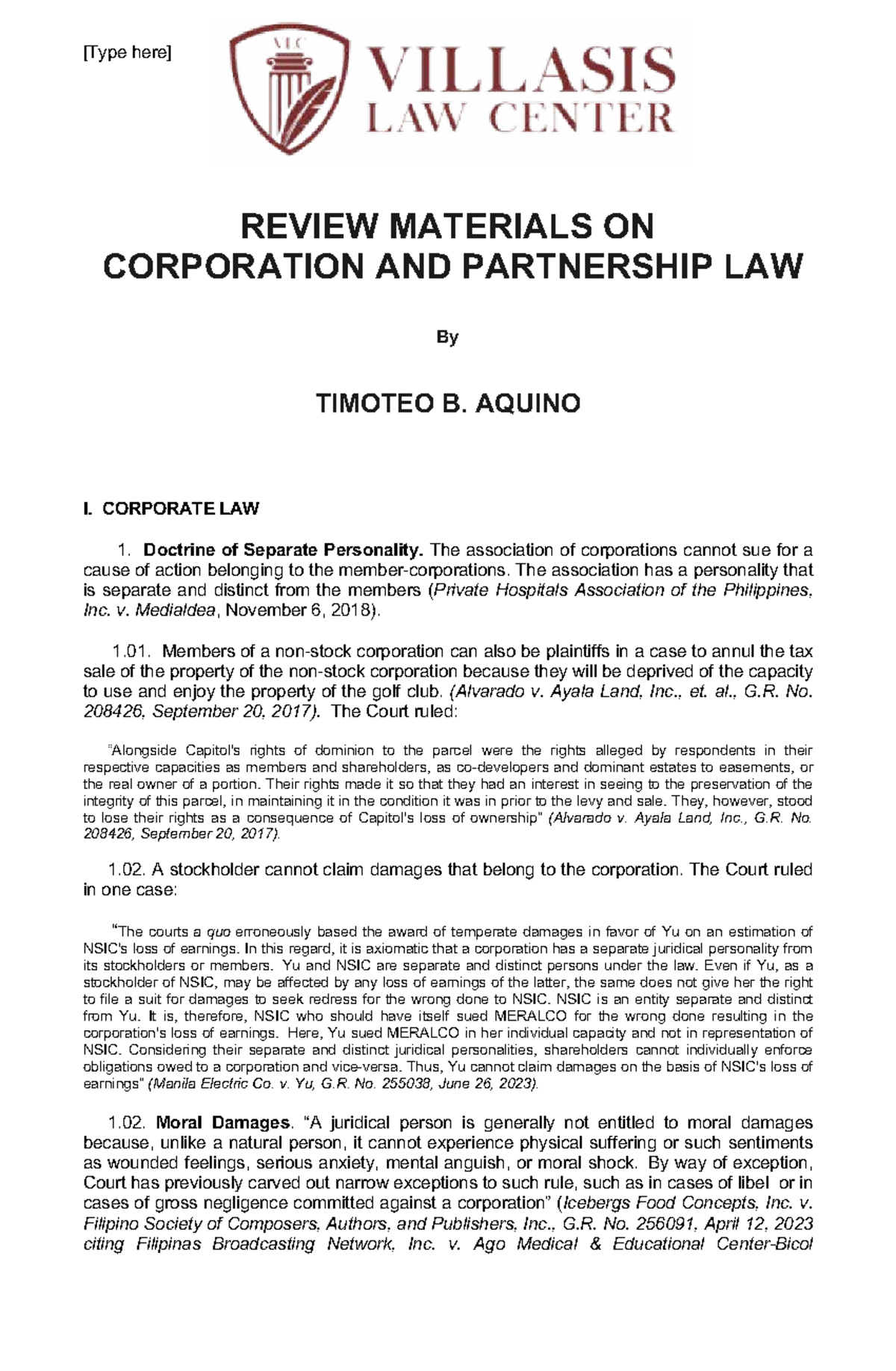 REVIEW MATERIALS ON CORPORATION AND PARTNERSHIP LAW (CPL 101) - Studocu