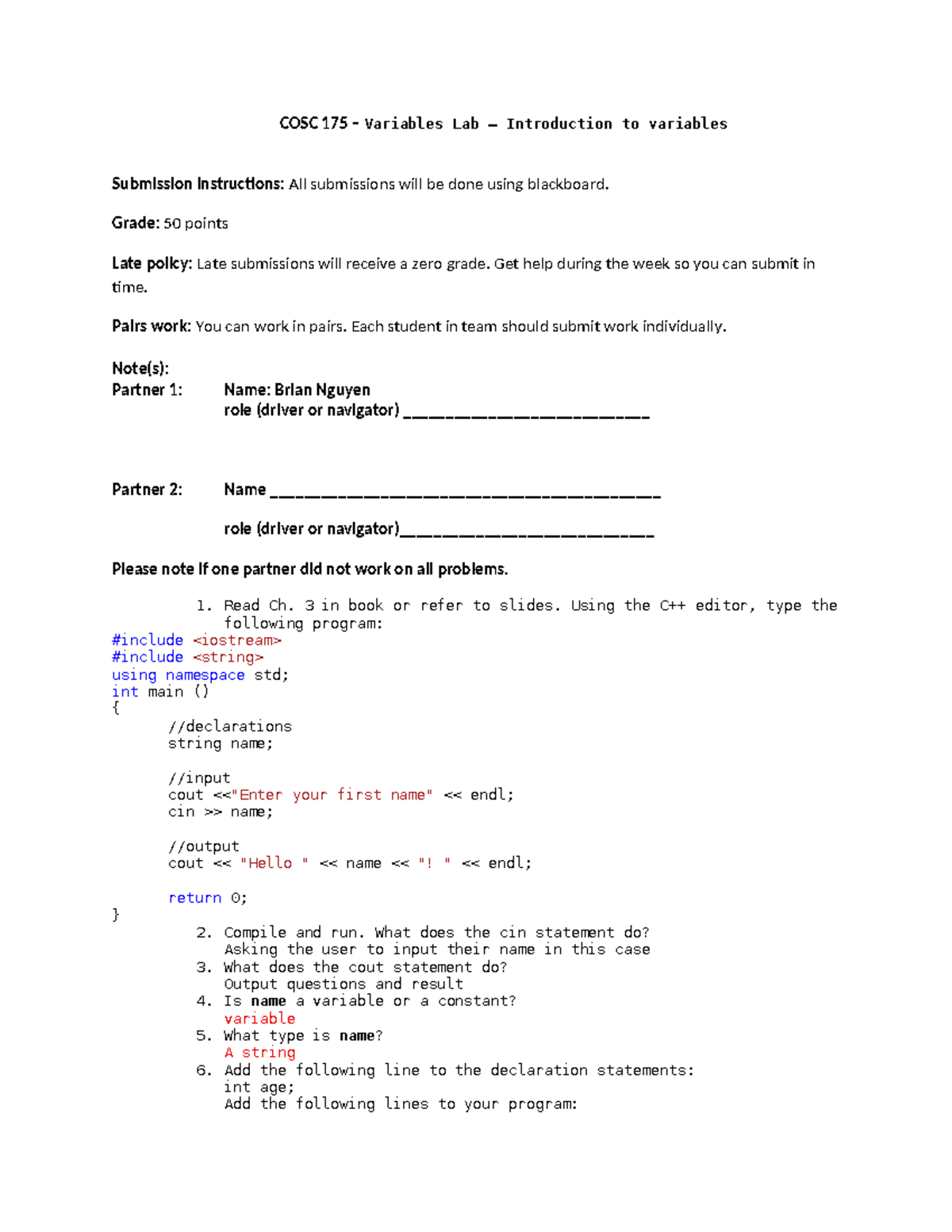 COSC 175 Variables Lab: Introduction to Variables and Submission ...