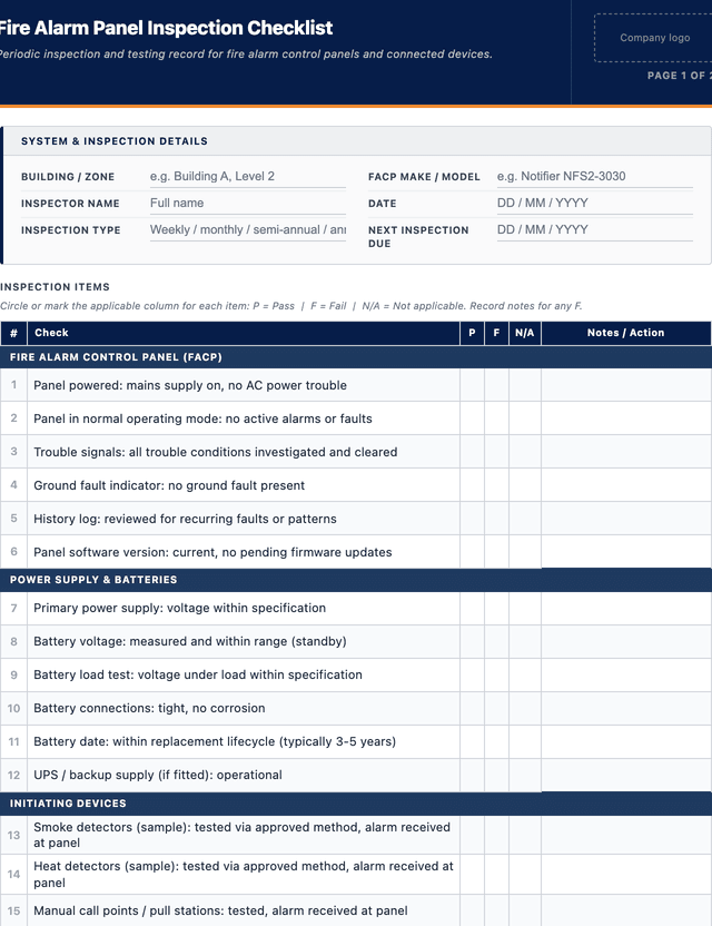 Free Fire Alarm Panel Inspection Checklist (PDF) | MapTrack