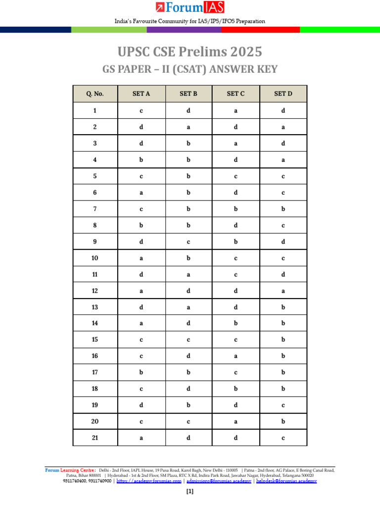UPSC Prelims 2025 Answer Key β GS Paper 1 & CSAT (All Sets) PDF
