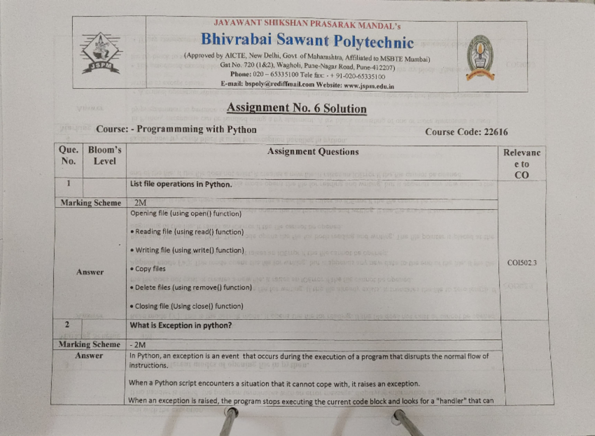 Python 6th assignment - ... - 1 SP Que. Bloom's No. 2 Level Marking ...