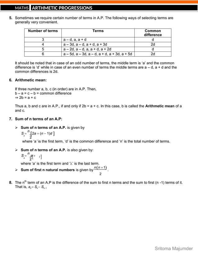 10 Maths Arithmetic Progression Notes Question Bank - 5 0 Mathematics-X ...