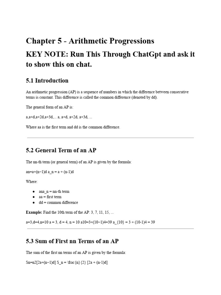 Cbse Class 10 Maths Notes Chapter 5 Arithmetic Progressions | PDF