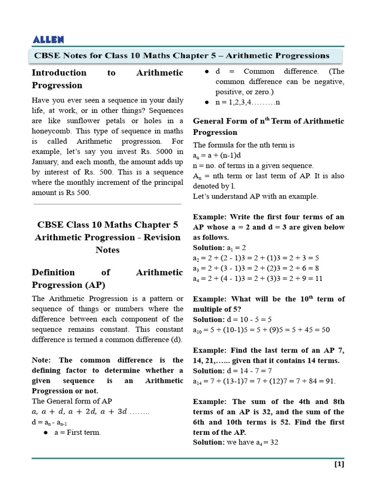 CBSE Notes for Class 10 Maths Chapter 5 – Arithmetic Progressions | PDF ...