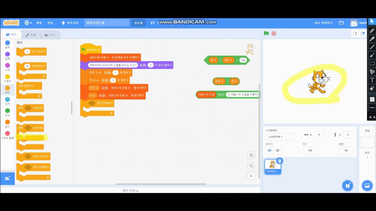 스크래치로 피보나치 수열 출력하기 - YouTube