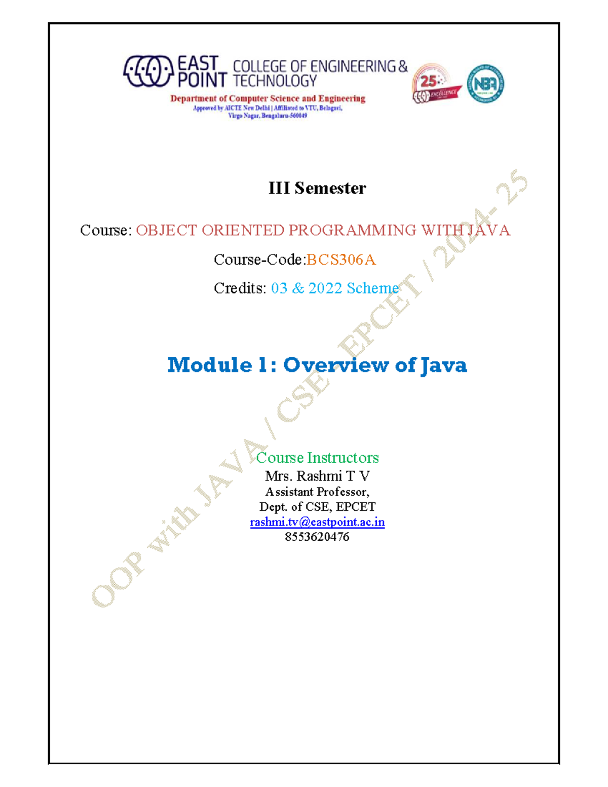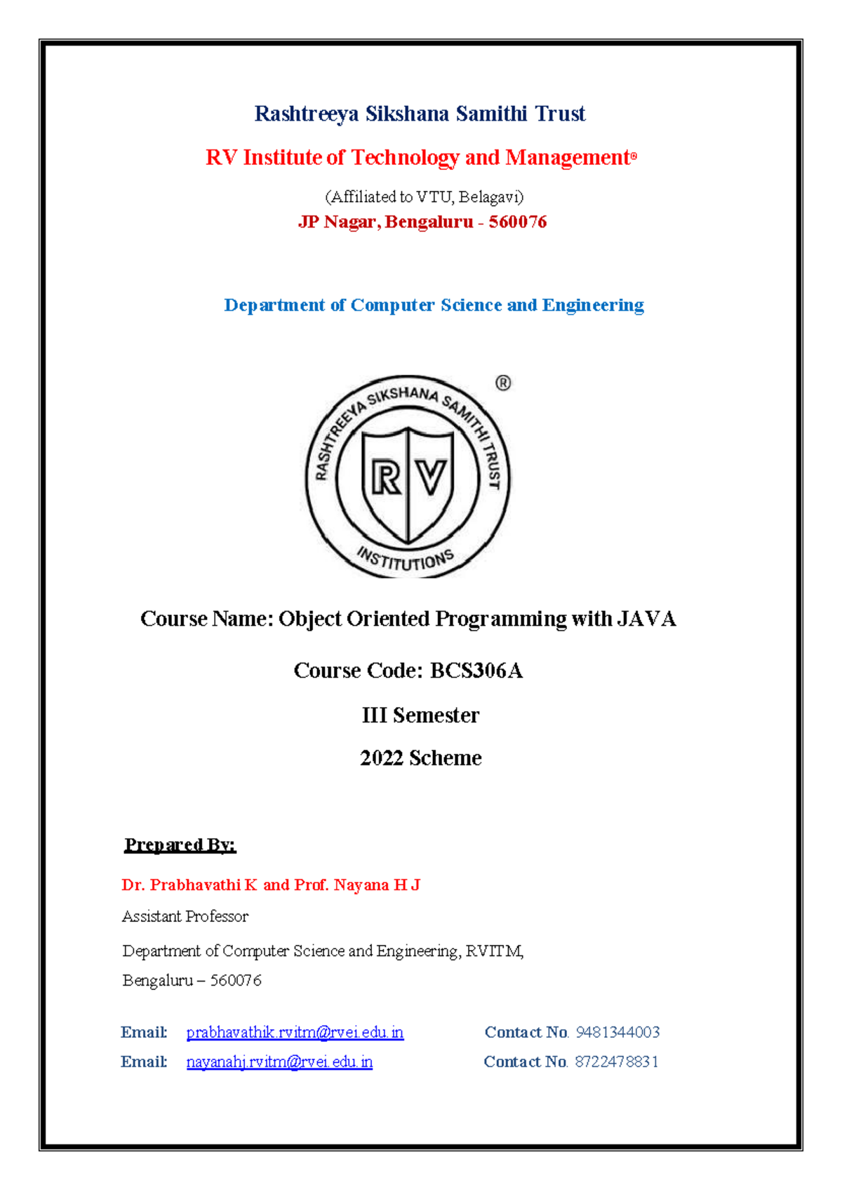 BCS306A Object Oriented Programming with JAVA Syllabus Overview - Studocu