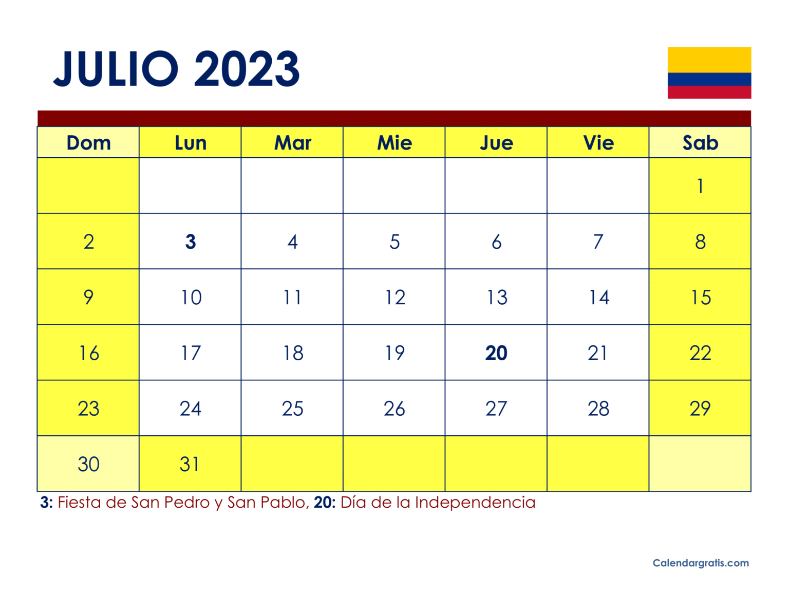 Calendario Julio 2023 con Festivos Para Imprimir(Colombia)