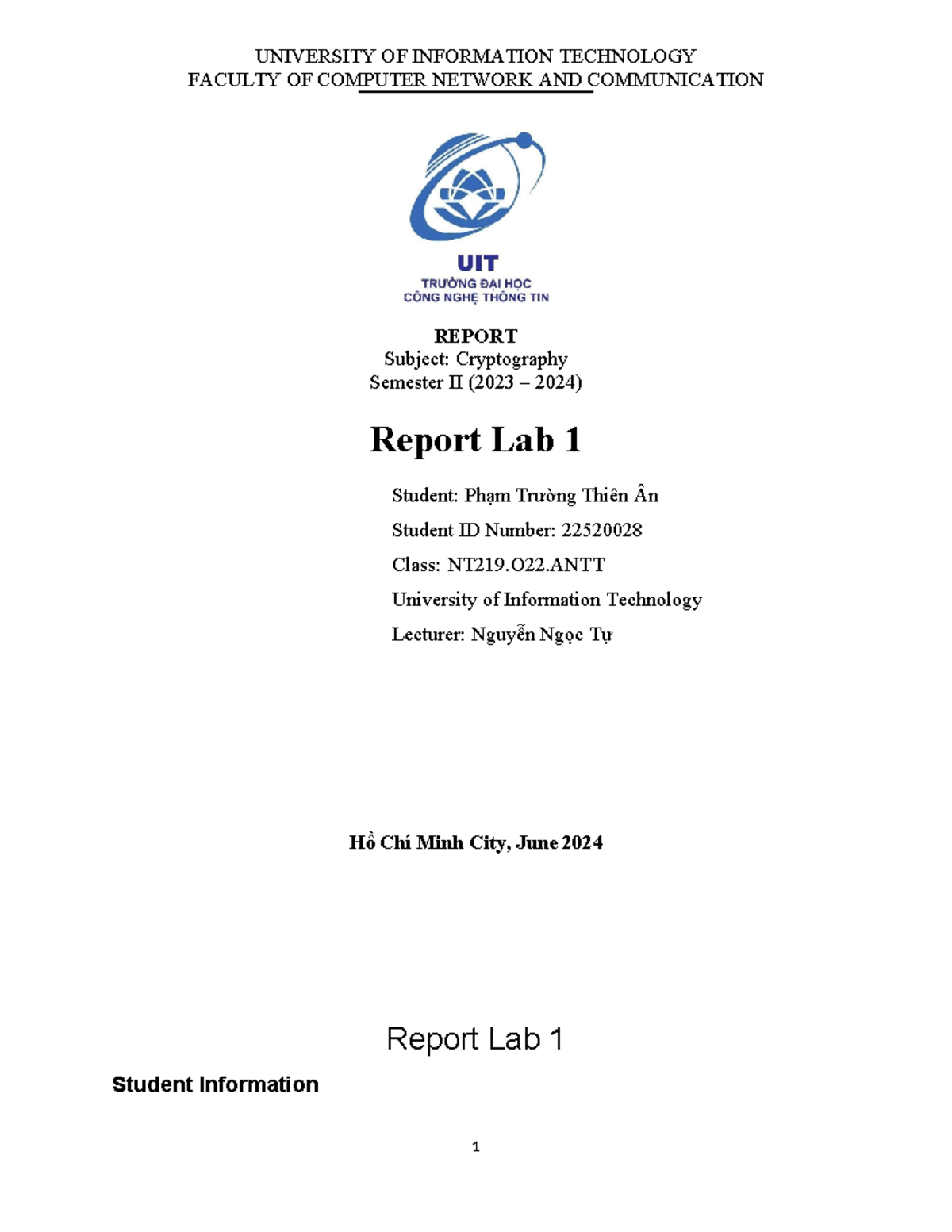 Lab 1 Report: Cryptography for Class NT219 - Semester II 2023-2024 ...