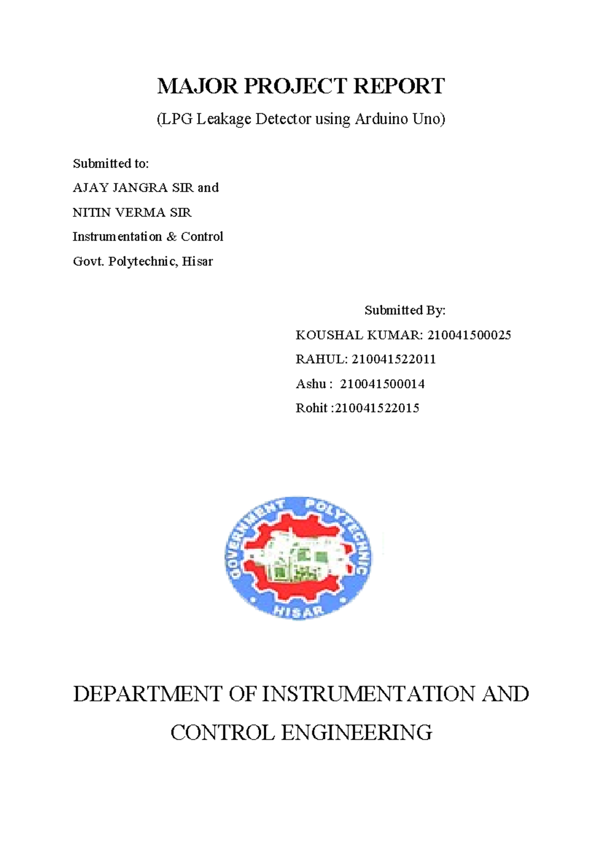 LPG Leakage Detector Project Report (210041500025) - Major Project ...