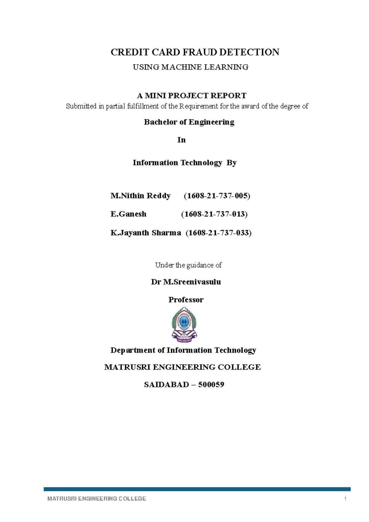 CSE - Mini Project Report on Credit Card Fraud Detection Using ML - Studocu
