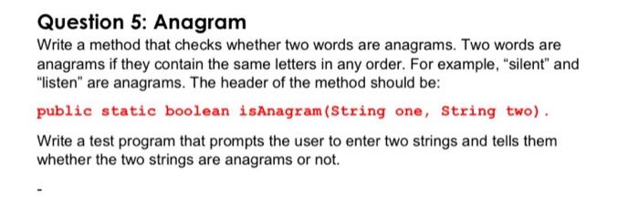 Solved Question 5: Anagram Write a method that checks | Chegg.com