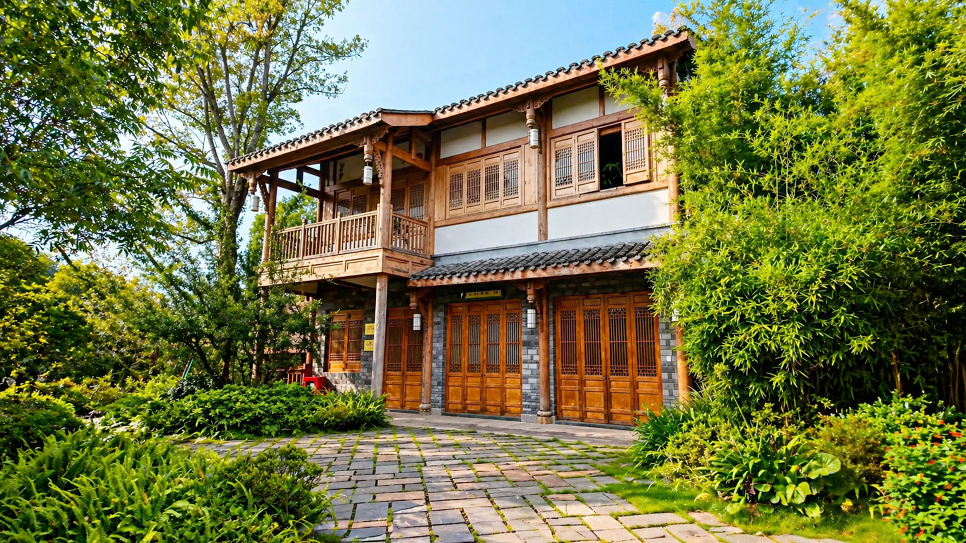 Et trehus skjult blant planter med et rolig og naturlig miljø