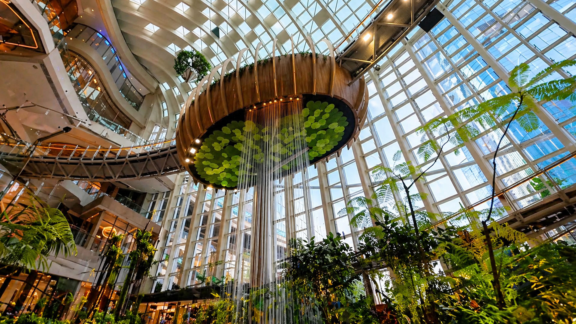 Et kjøpesenter med glasstak, hengende vannelement og grønt