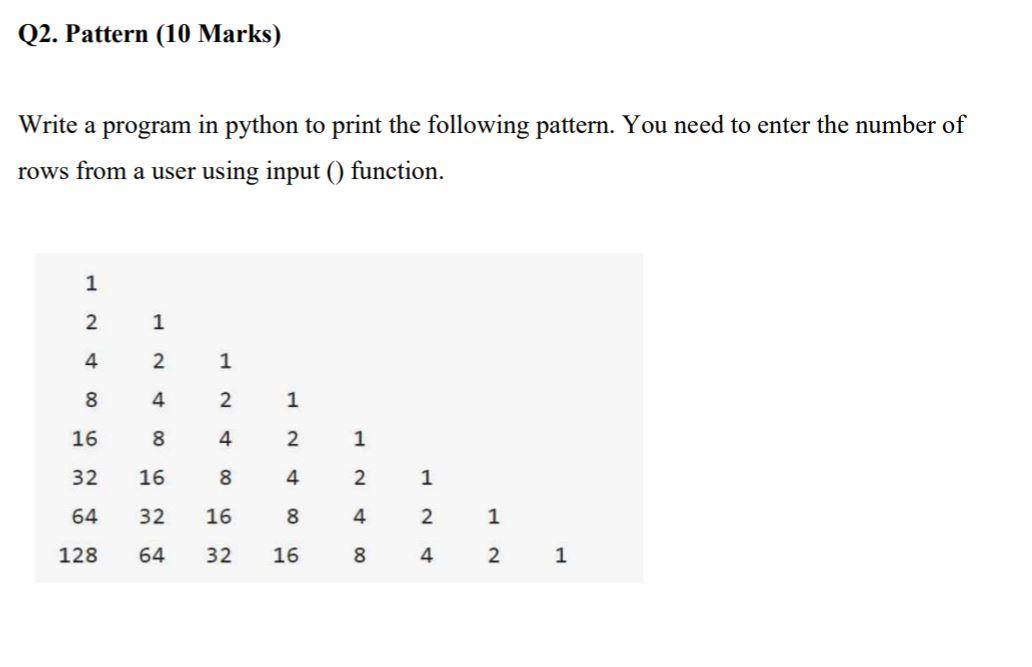 Based on this image's title: “Solved Q2. Pattern (10 Marks) Write a program in python to | Chegg.com