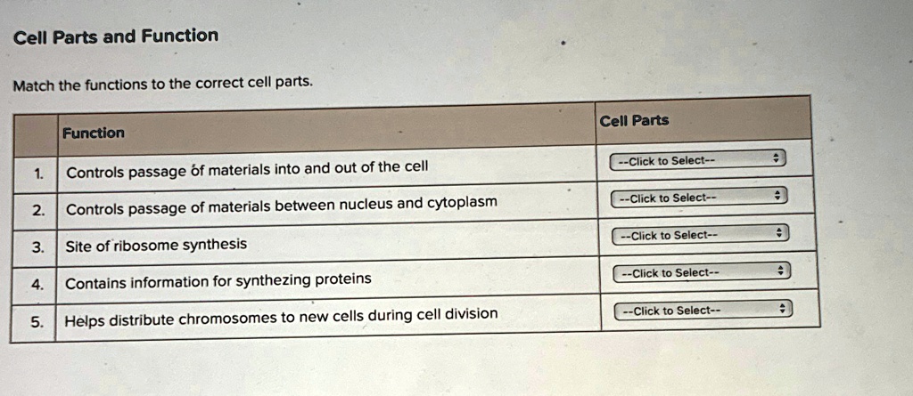 SOLVED: Cell Parts and Function Match the functions to the correct cell ...