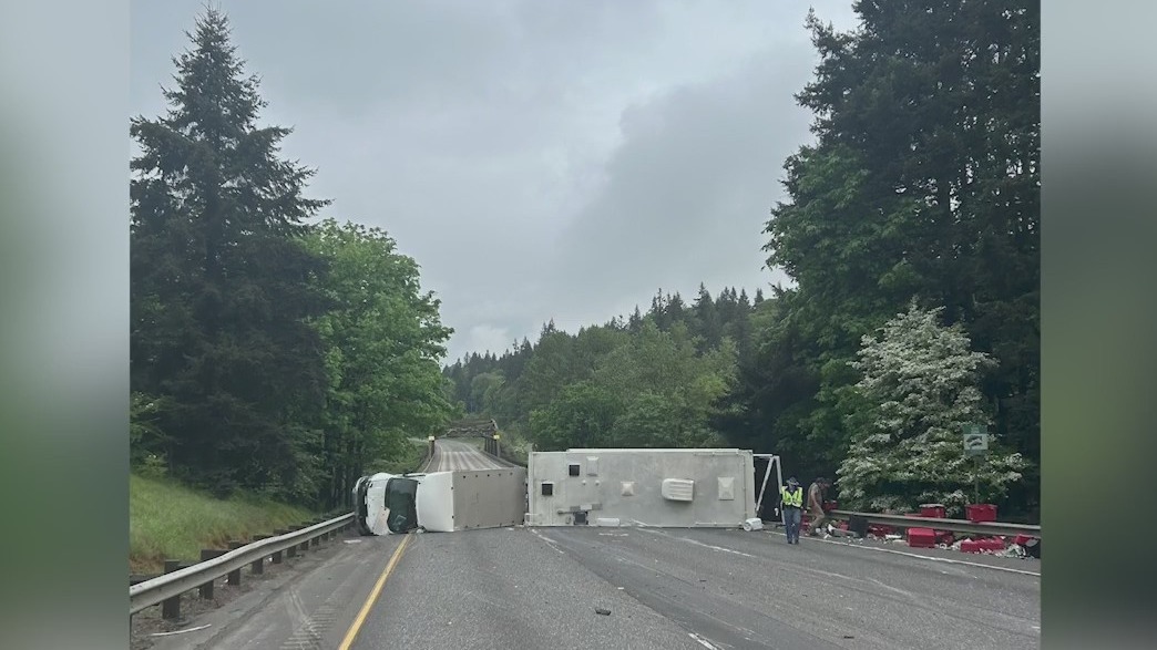 I-5 traffic stalled after toy hauler crashes onto side near East Fork ...