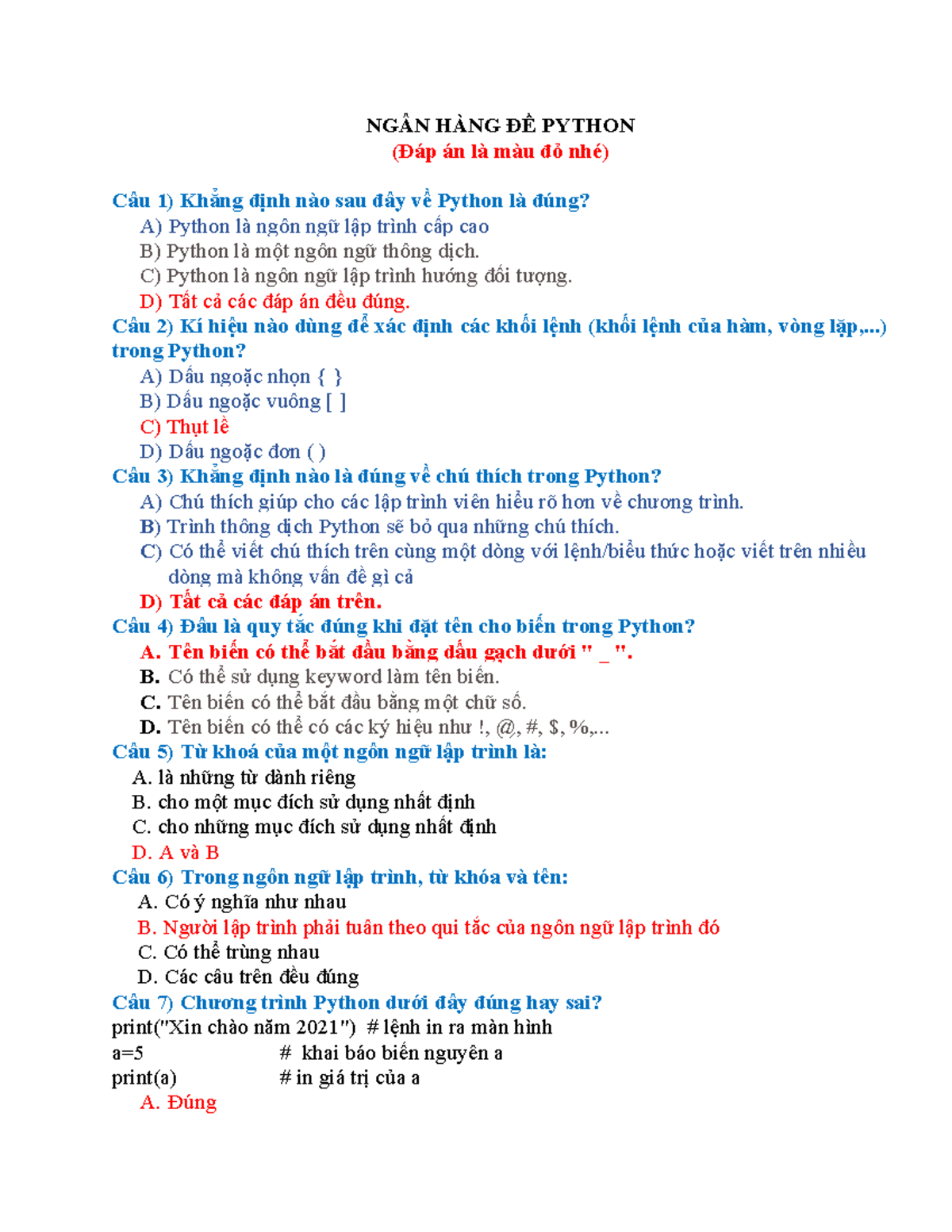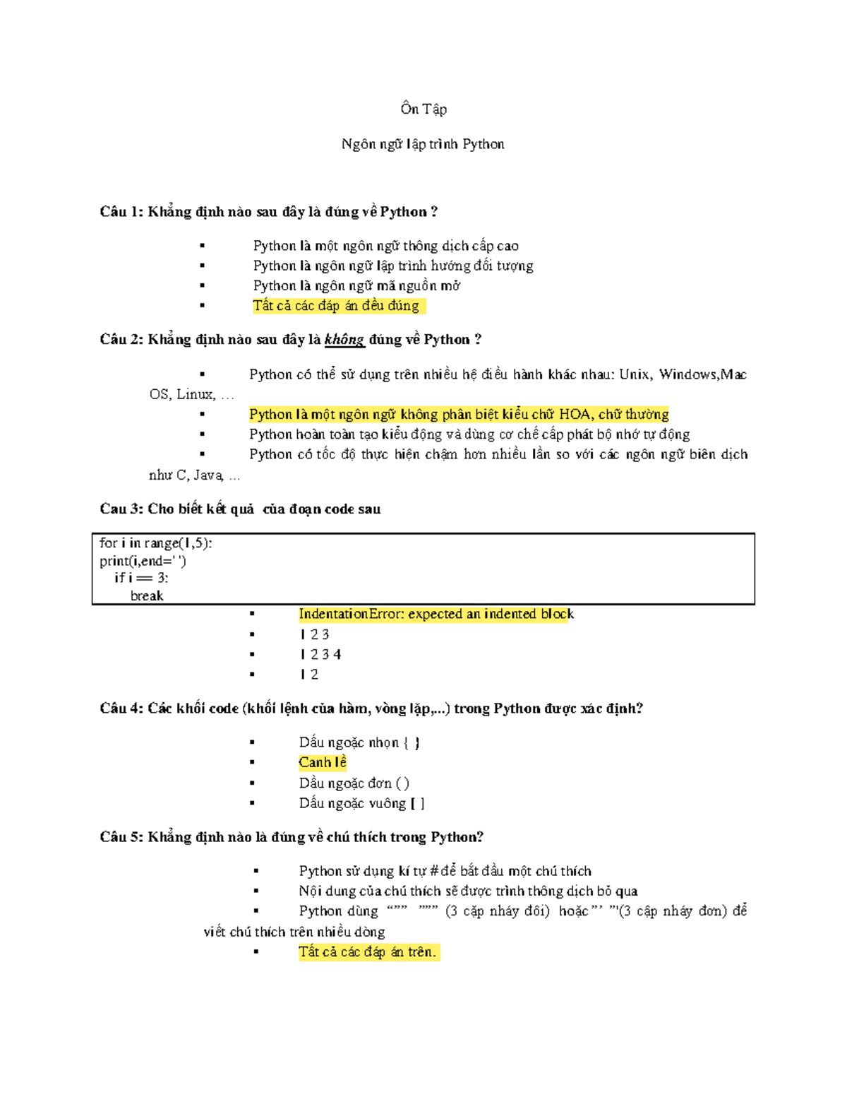 Câu hỏi ôn tập Python - Ngân hàng đề Python - Studocu