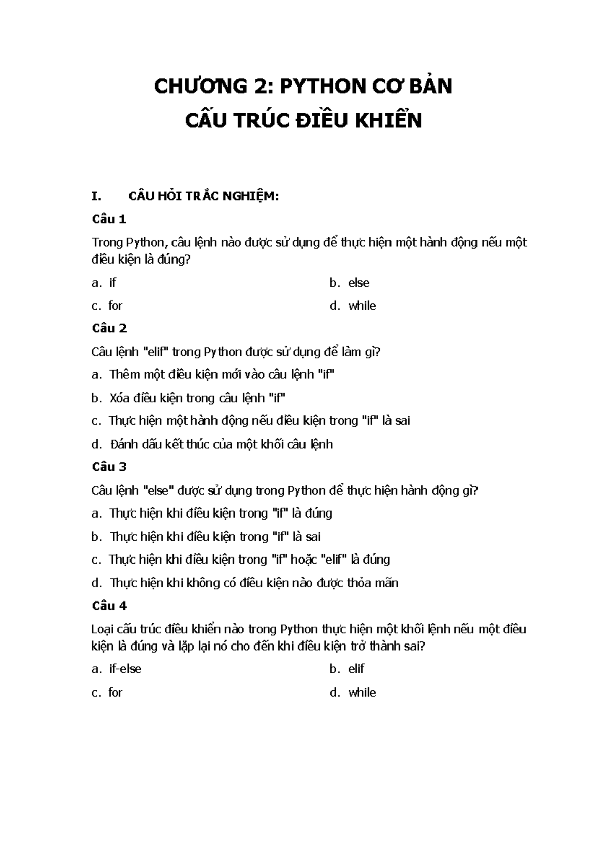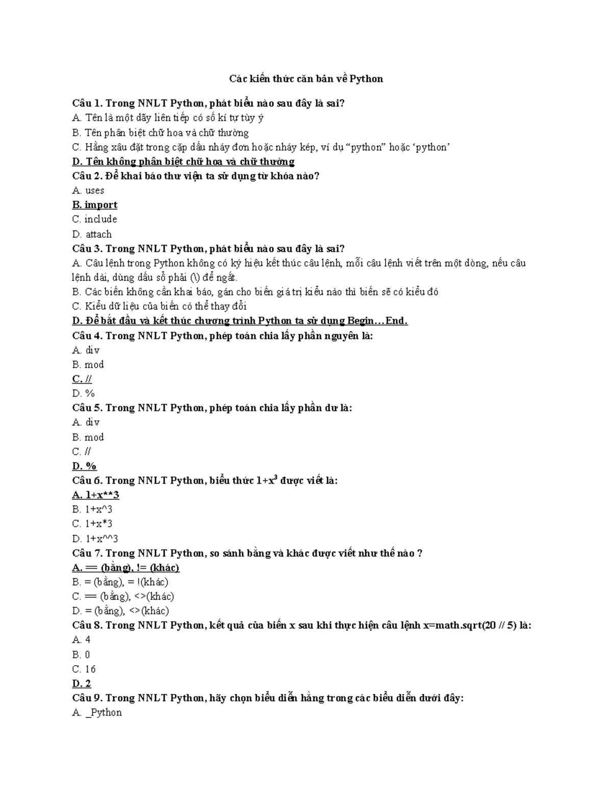 BAI TAP CHƯƠNG 2: CÂU HỎI TRẮC NGHIỆM VỀ PYTHON CƠ BẢN - Studocu