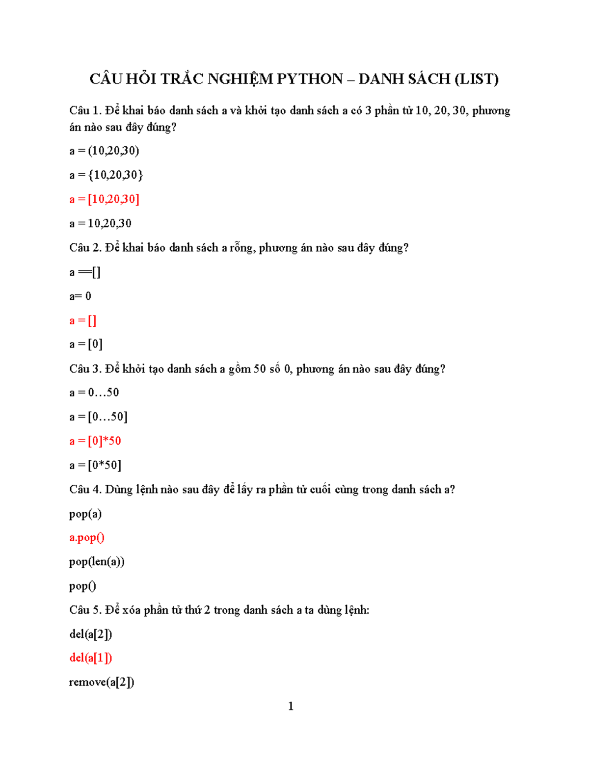 Câu hỏi trắc nghiệm Python – Cấu trúc Danh sách và Vòng lặp - Studocu