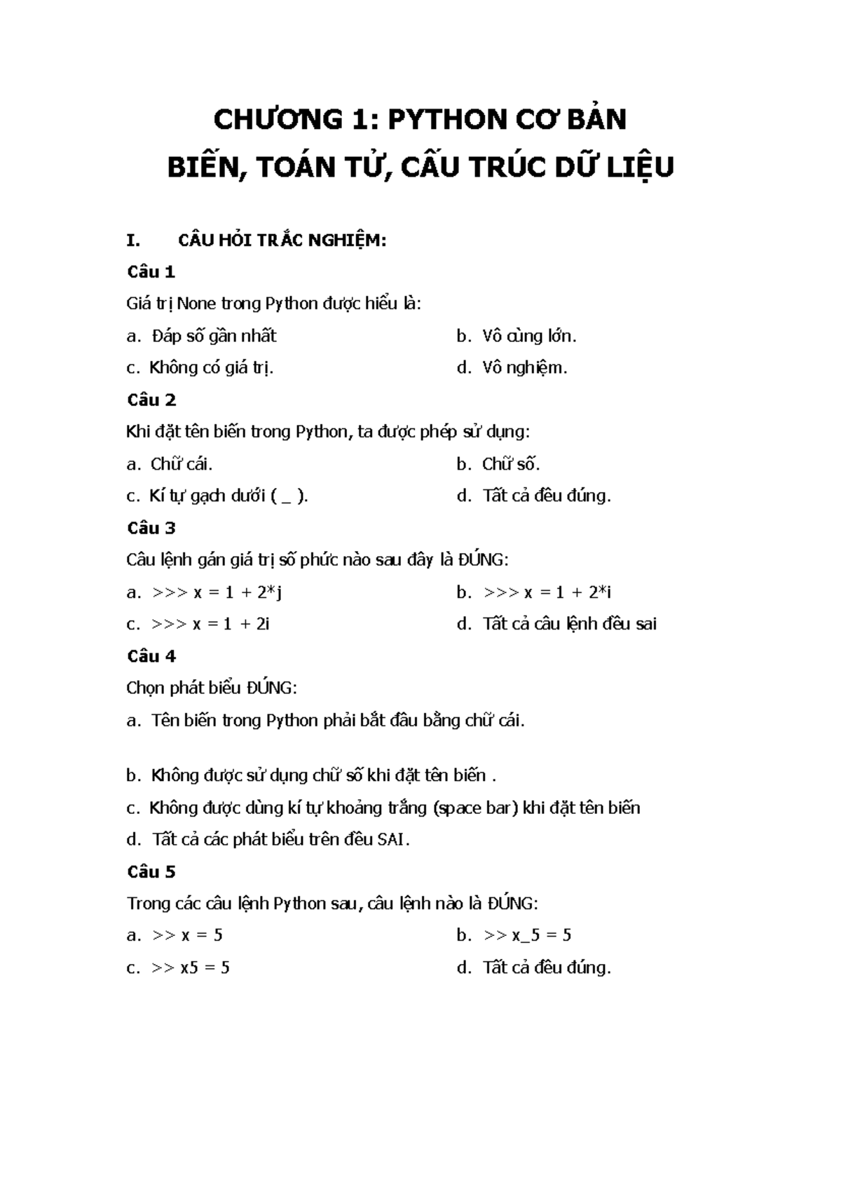 BAI TAP CHƯƠNG 1: PYTHON CƠ BẢN VÀ CÂU HỎI TRẮC NGHIỆM - Studocu