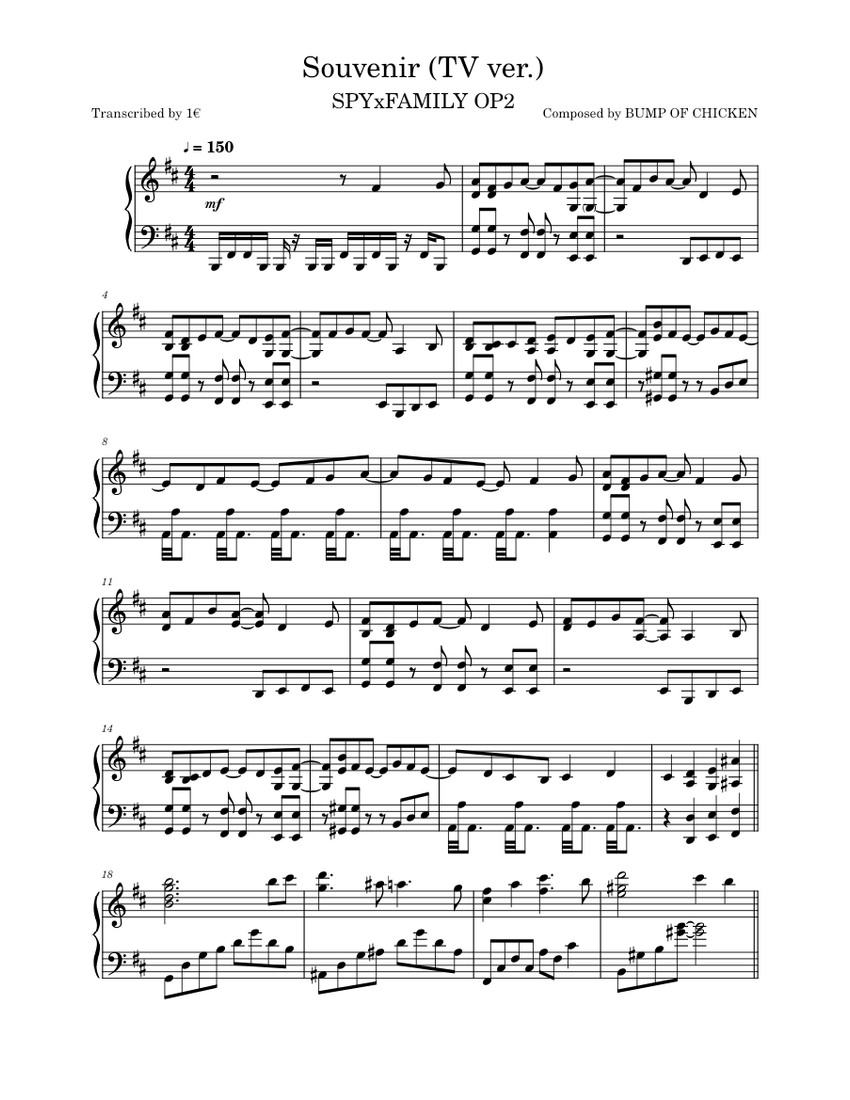 SOUVENIR β BUMP OF CHICKEN (TV ver.) SPYxFAMILY OP2 Sheet music for ...