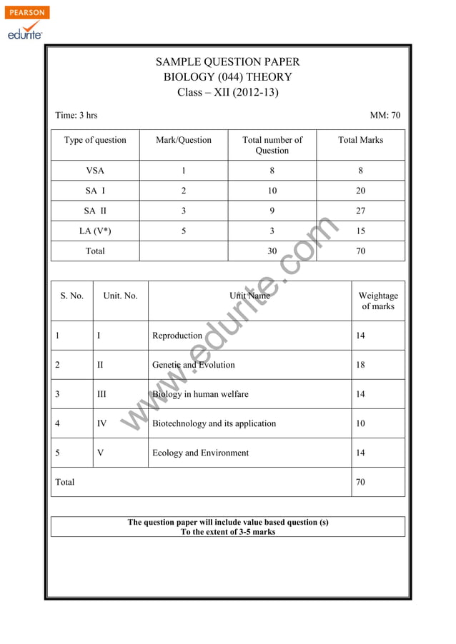 CBSE Class 12 Biology Practice Paper with Marking Scheme for Board Exam ...
