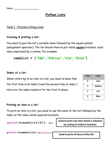 Python Lists Task Sheet - Activities and Basic Challenges | Teaching ...