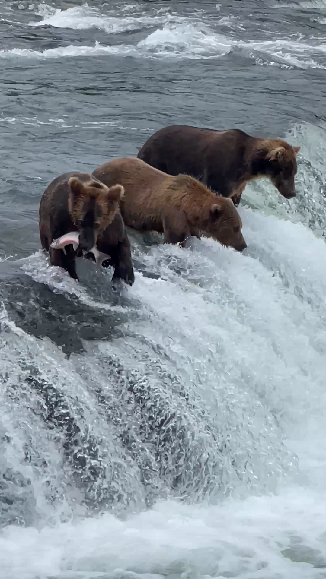 Bears catch fish in river during feeding moment