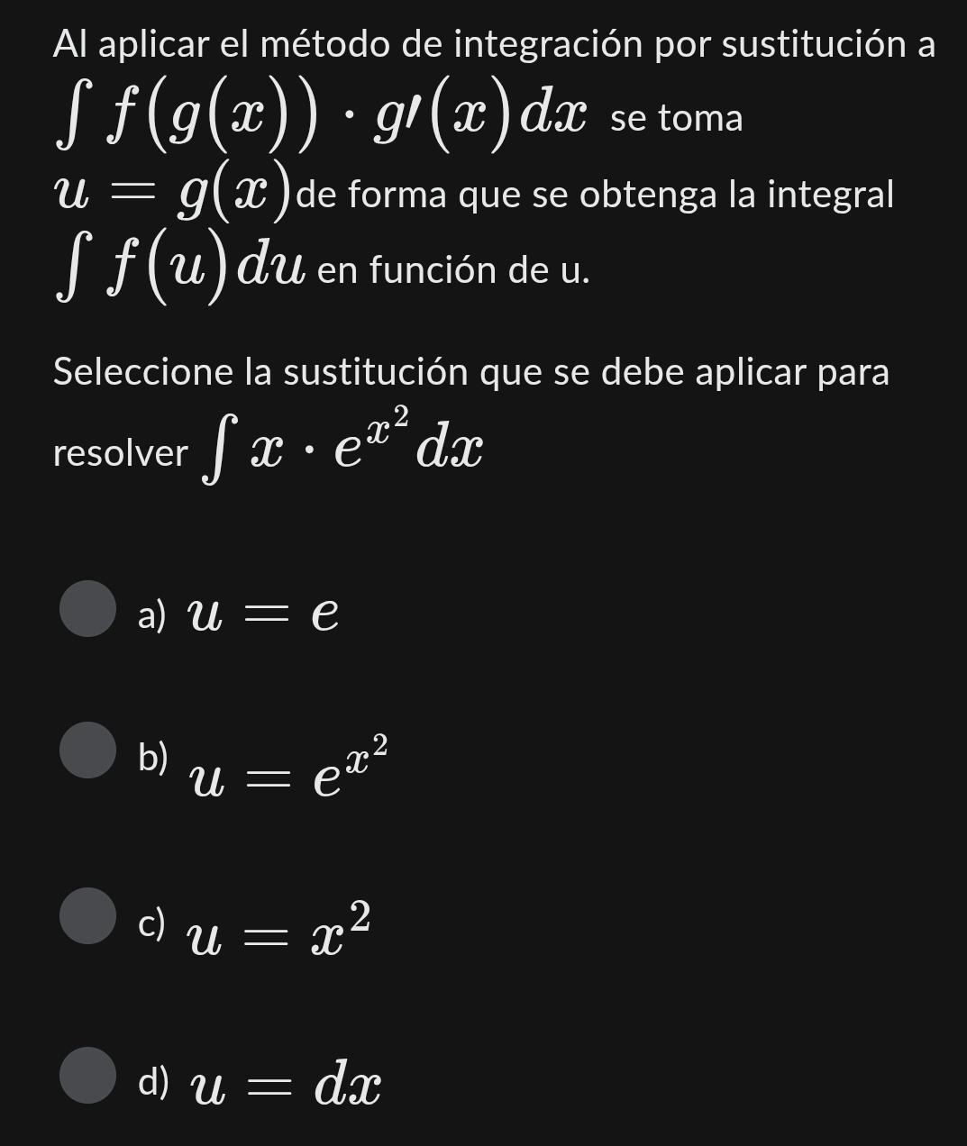 Resuelto:Al aplicar el método de integración por sustitución a ∈t f(g(x ...