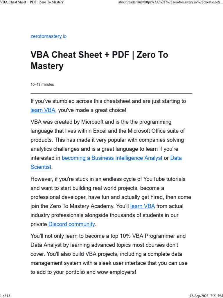 VBA Cheat Sheet + PDF Zero To Mastery | Download Free PDF | Microsoft ...