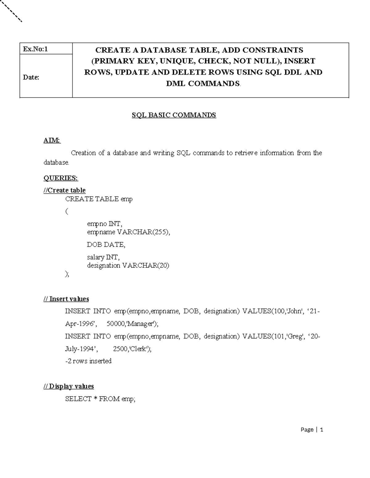 DBMS-LAB-1: SQL DDL & DML Commands Implementation Manual - Studocu